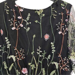 Step into a fairytale garden with this enchanting Size 5XL Bloomchic blouse. Its delicate floral embroidery dances across soft black mesh, a harmonious blend of whimsy and elegance. Perfectly tailored for curves, this piece offers both comfort and style, ideal for embracing your inner bohemian spirit. A timeless addition to your wardrobe. Such a pretty embordered blouse very light and flowy it's definitely special! ✨✨