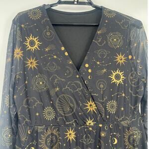 BloomChic, celestial print, astrology dress, cosmic pattern, sun and moon, sheer mesh overlay, bell sleeves, long sleeve midi dress, black gold dress, witchy dress, celestial boho, ethereal, Whimsigoth, modern mystic, fall fashion, Halloween party, romantic goth, plus size, New with tags, Mesh, Sheer,