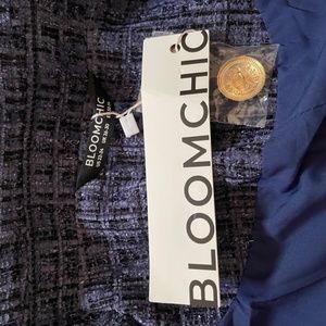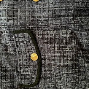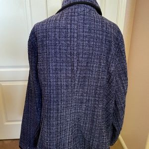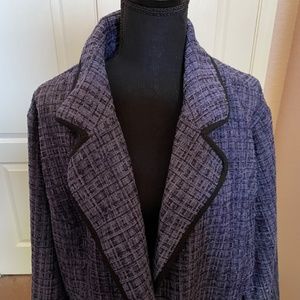 Purple and black jacket has three gold colored button closure with 2 front pockets. Fabric has metallic threads and black trim at hem, wrist and collar. Size 22/24. New with tags