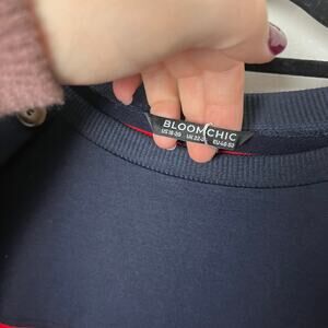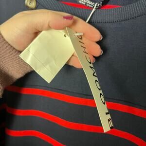 New with tags condition - no flaws or signs of wear. No snags, holes, or stains. Blue and red striped sweater with a nautical, preppy look. Buttons on the shoulder. Polyester, spandex, and cotton blend of fabric. Machine washable. Smoke free pet friendly home. All offers are welcome.