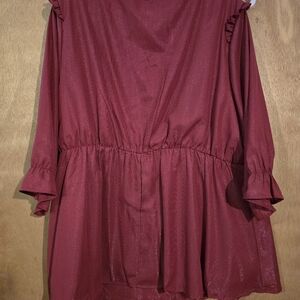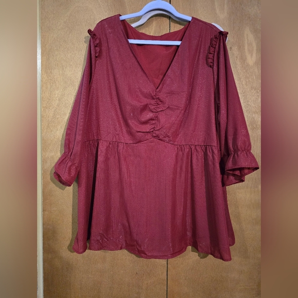 Nice Burgundy top. Worn to try on. I do not have the bust for it and don't know why I keep buying long sleeves. It is always too warm where I live. The fabric has sparkle in it.