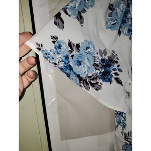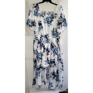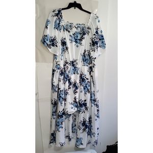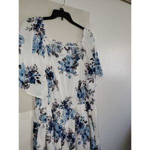 This is a stunning piece of clothing. It is a cross between a dress and a romper. It is a beautiful white with blue roses all over. The back of the top is smocked and the neckline has a ruffle all the way around. The waist is gathered and comes down into the skirt which is split in the front and allows the skort to be visible. The skirt then angles down the sides and is long in the back. This piece has a very silky feel to it- 98% polyester and 2% spandex. You could wear this piece to weddings, church, and many other spring/summer activities. It is in very nice pre-owned condition.
