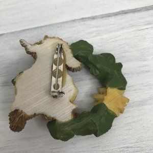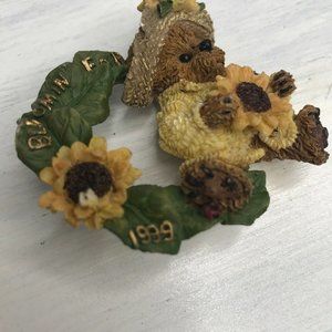This is a pin from 1999. It is a Boyd's Bear Pin from their Bearwear line. Teddy bear in a jacket and hat holding a sunflower and wearing one on the hat. The wreath with leaves and sunflower Ladybug and butterfly "Bloomin for 1999" in gold. Pin is made of resin and hand painted. Standard locking pin back.