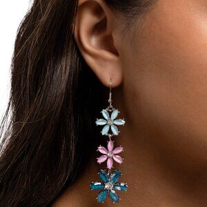 Three stacked floral frames cascade from the ear, each featuring a ring of marquise-cut petals in alternating shades of blue and pink. A white rhinestone dots the center of each bloom, adding a playful sparkle to the colorful arrangement. Earring attaches to a standard fishhook fitting.