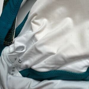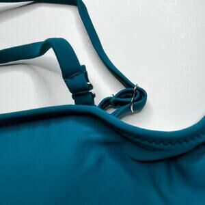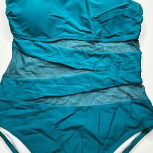 Blooming Jelly one piece swim suit. Sheer mesh inserts in the middle of the suit. Adjustable and removable strap. Removable bra pads. Teal color. 82% nylon, 18% spandex. New with tags. Size M.
