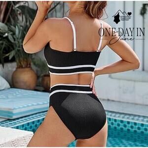 This ribbed black bikini set cuts through the summer haze like a sleek panther stalking through the concrete jungle of poolside chaos, with its high-waisted bottom promising to transform any ordinary beach day into a wild expedition of sun-soaked confidence. The crop top design rides the perfect wave between modest coverage and rebellious style, crafted from a polyester-spandex blend that moves with the fluid grace of a desert mirage. Brand new with tags still attached, this Blooming Jelly creation awaits its moment to unleash aquatic mayhem upon unsuspecting beach towns across the nation.