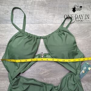 This green one-piece swimsuit hits like a revelation in the desert heat, with its strategic cutout design and tummy control technology that'll have you feeling like a goddess emerging from the crystalline waters of some impossible lagoon. The Blooming Jelly masterpiece wraps around your form with the precision of a master craftsman, that polyester-spandex blend moving like liquid mercury against skin that's been kissed by too much sun and not enough sleep. Brand new with tags still attached, this aquatic armor is ready for whatever chaos the poolside apocalypse might bring your way.
