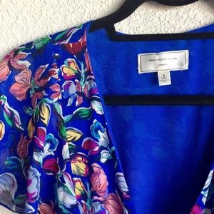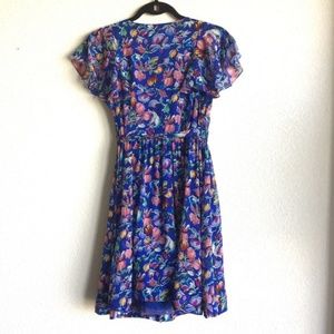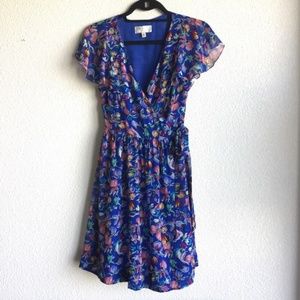 Amazing and stunning! Floral Silk Blooming Sapphires Silk Wrap Dress By Moulinette Soeurs, from Anthropologie. Beautiful soft sheer flutter cap sleeves, tie waist with a button on inside panel to secure front wrap around. Fully lined. The kicker??? POCKETS! 100% Silk, Polyester Lining.