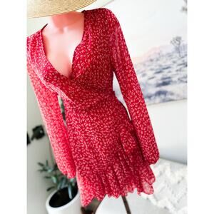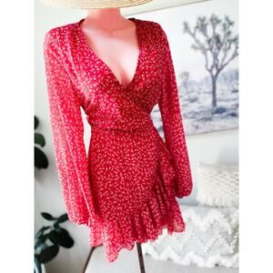 Step into meadowlight magic with this floaty wrap dress, adorned in delicate ditsy florals that feel straight out of a storybook. The deep, cottagecore-inspired crimson base is scattered with tiny white blossoms—like wildflowers pressed between pages of an old diary.