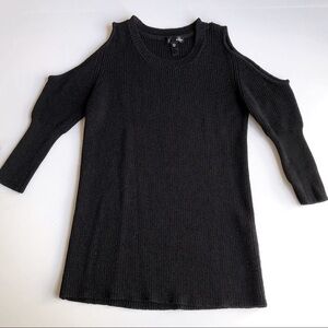 Bloomingdale’s AQUA Cold Shoulder Sweater in black. Knit scoop neck sweater with cut outs at shoulders. 3/4 length sleeves. Ribbed neckline and cuffs. Slightly stretchy fabric. Longer fitted silhouette. Worn but in excellent condition with no visible signs of wear. Approx. 24” long and 16” across from armpit to armpit.