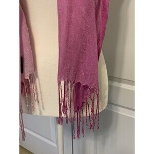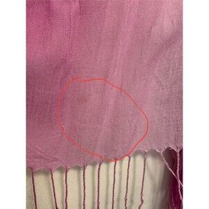 Exclusively for Bloomingdales, women's pink ombre scarf/wrap. Measures about 70" long (not including the fringes on the ends) and about 30" wide. Versatile scarf, lightweight and made of 100% viscose. Please note that there are some runs and pulls in the fabric from being caught on jewelry or zippers. There are also a couple of small spots/stains on one end (see photos). Dry Clean Only.