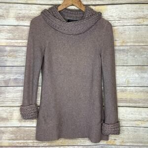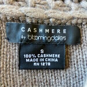 Bloomingdale’s S 100% Cashmere cowl neck sweater detailed collar. The sweater is lovely and thick. It’s a really nice super soft cashmere. Unfortunately it does have a big hole on one of the cuffs. Please look at photo when folded you will not see the hole or it could be repaired. Sold as is