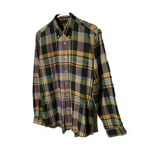 This vintage Bloomingdale's shirt is a colorful and modern addition to your wardrobe. With a striped pattern, long sleeves, and a collared neckline, this button-up shirt is perfect for both casual and business occasions. The shirt has a regular fit and is a size medium.