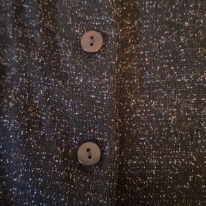 Stunning Bloomingdale’s black and gold wool blend knit cardigan sweater. Black with gold threads in fabric. Long sleeves. Button front closure. Does not pill. Beautiful for day or evening. Size Small.