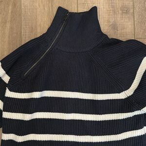 Great condition AQUA for Bloomingdales navy and white striped funnel neck sweater. Very soft and has an asymmetrical zip at the neckline!