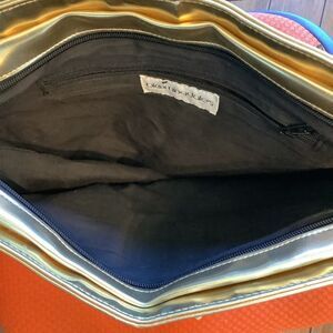Large gold tote with gold hardware. A few scuffs to outside of bag. Sure to make a statement. Perfect for work or school or the intended use...shopping!!