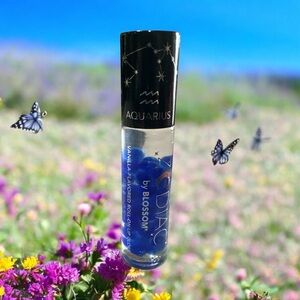 Blossom Zodiac Roll-On Lip Gloss in Aquarius – vanilla scented, ultra-moisturizing, and infused with zodiac crystals for a high-shine finish.