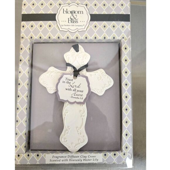 Blossom & Bliss Fragrance Diffuser Clay Cross Ornament, 4.25" Tall x 3" wide. There is no scent left on cross. Here are instructions to add scent to the porous clay: