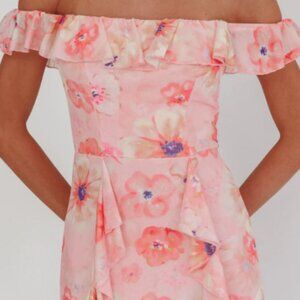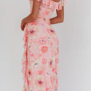 Feminine, flowy, and effortlessly elegant, the Blossom Breeze Off-Shoulder Maxi Dress is a vision of romance. Adorned with a beautiful poppy print in dreamy shades of pink, cream, and blue, this dress is made for sun-drenched days and magical evenings. The off-the-shoulder silhouette is accented with delicate ruffle details cascading down the front, shoulders, and chest, adding movement and charm to every step.