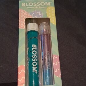 Set of two lip glosses: Blossom in teal and Iridescence in shimmering purple. Perfect for adding shine and color.