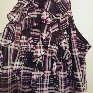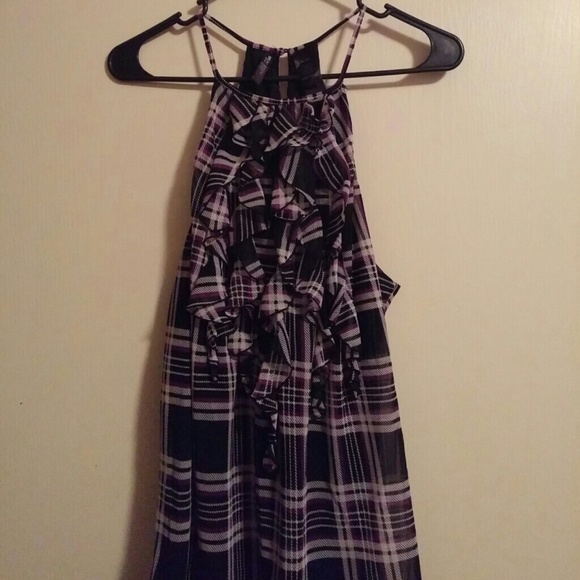 Nice plaid blouse with ruffles on the front. Button on the back.