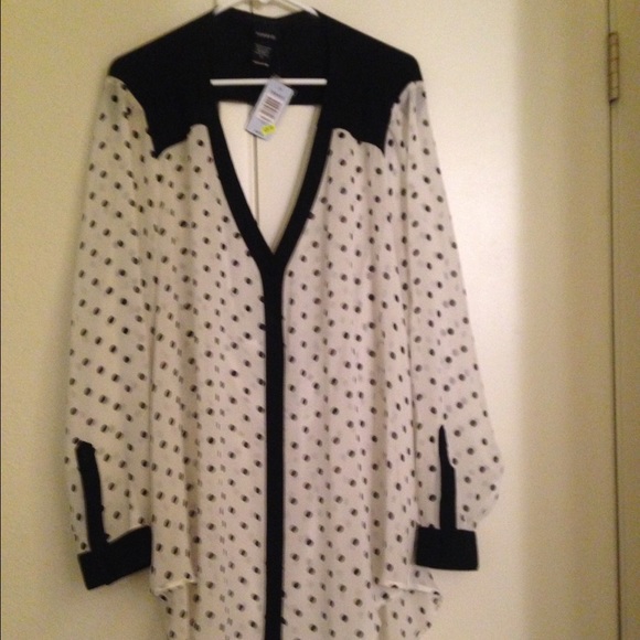 Lovely lightweight ivory blouse with black polka dots purchased from Torrid. Perfect for spring or summer with black pants or capris or with jeans and a pair of heels. Very cute!!!