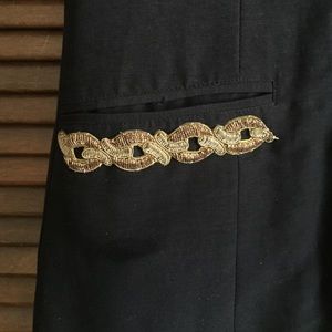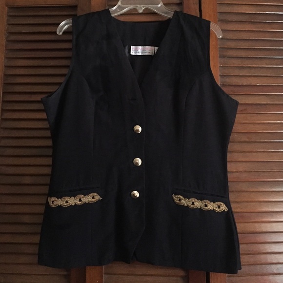 Black vest blouse, missing one button, sleeveless, pockets with gold accent