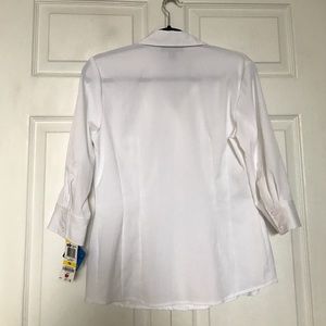 3/4 length sleeve with 2 buttons on each sleeve. Color; Bright White. 95% polyester 5% Spandex. Perfect for work, or wear with jeans.