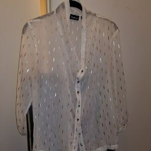 Sheer/Ivory color, Gold accents over entire blouse. Slight drape front collar. About 2 inches longer back, Classy with an edgey appeal. Unique. Dress it all the way up or throw on your skinny jeans, maybe even worn with a blazer and high waist pants... JEANS FOR SALE
