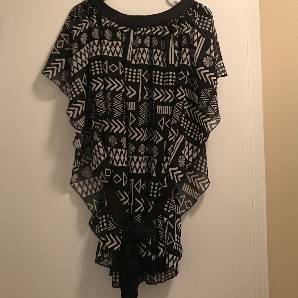 It a black and white blouse with a silk neck line and tribal designs with a silk knot (belt)