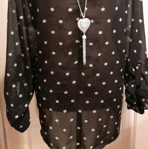 Sheer black with gold stars button almost half down blouse. Perfect for layering or a fun light summer shirt. Necklace not included.