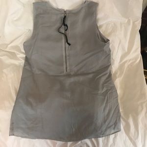 Sleeveless, gray top. Ruffles on the front and exposed zipper in the back.