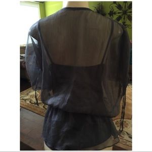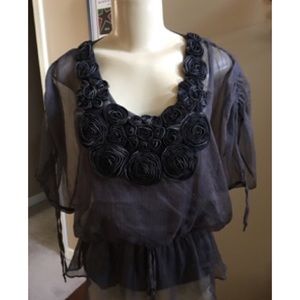 NEW without tags - charcoal grey semi sheer blouse with braided rosettes and drawstring sleeves . Camisole lining included. Size Large.