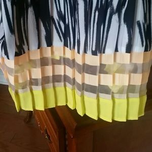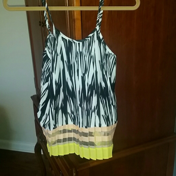 Black and white thin strap blouse with peach and lime green towards the bottom of top