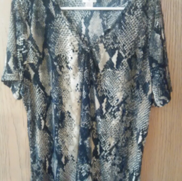 Semi sheer snakeskin pattern loose fitting blouse in shdes of black gray and off white .
