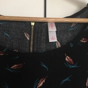 Black feather wide style blouse. It has falling feathers and zipper detailing on the back. Normal length blouse