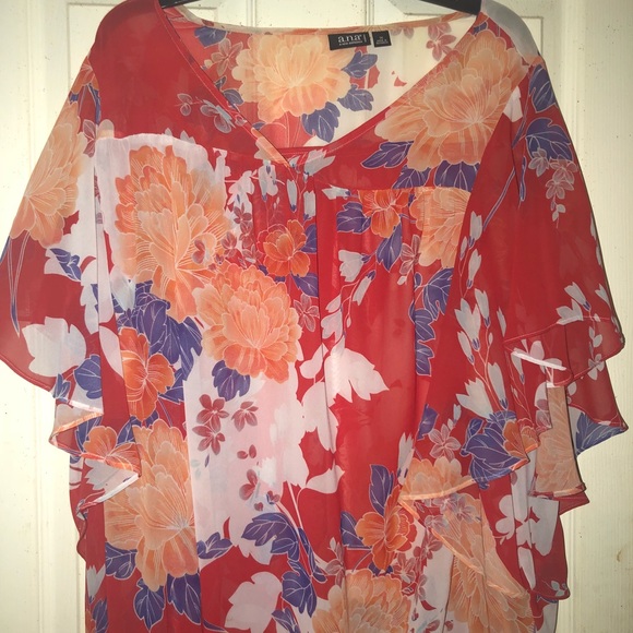 Vibrant flowing shirt to keep you cool, but stylish! This shirt is thin and requires a cami underneath. I received many compliments on this piece.