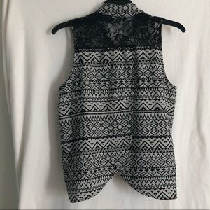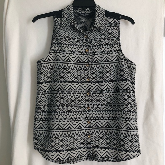 Tank style blouse, geometric shapes printed in black, gold buttons with a lace yoke.