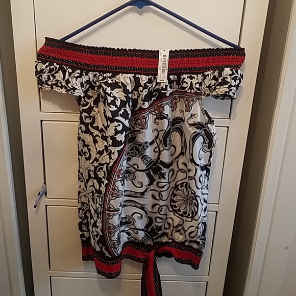 White house Blk Market off shoulder blouse. Beautiful for the holiday season.