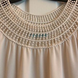 Cream 3/4 sleeve blouse with woven detail on neck line.