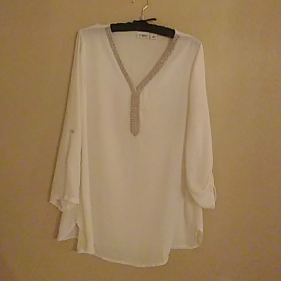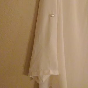 Cream colored sheer shirt tail blouse f Cato size Medium. Has faux pearl detail on front.