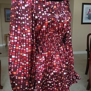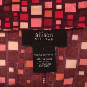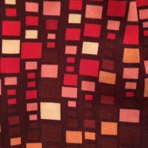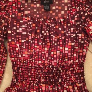 Bold, bright, blouse with a dramatic and ultra-cool pattern. It is long, and cinches at the waist in a 2-1/2 band (which is super flattering on!). Its long sleeves also have some elastic at the wrist. This blouse looks fantastic with a pair of jeans/leggings and high heels or boots and some equally dramatic jewelry. Make a statement when you walk in the room with this piece!