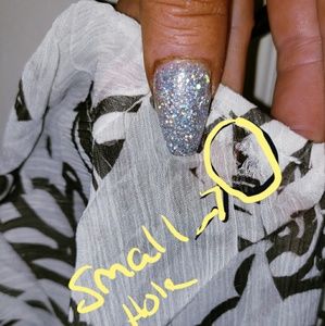Sheer white and black blouse bottom hem is a silky cotton texture frm Charlotte Russell has a small hole located upper left side by neck trim it's not noticeable unless pointed out since there's a slight rousing