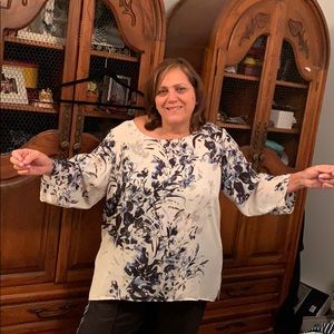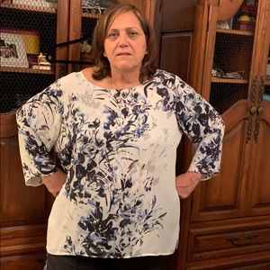 Very comfortable, Flowy-type blouse. Worn twice, no stains or wear & tears. Fabric is very comfortable to wear. Label says 100% polyester; hand wash & line dry.