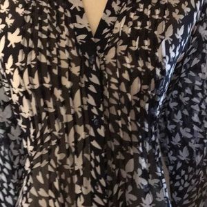 L/s navy and white print tunic with 3/4 sleeve and pleated v neck opening.