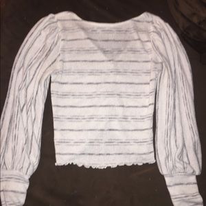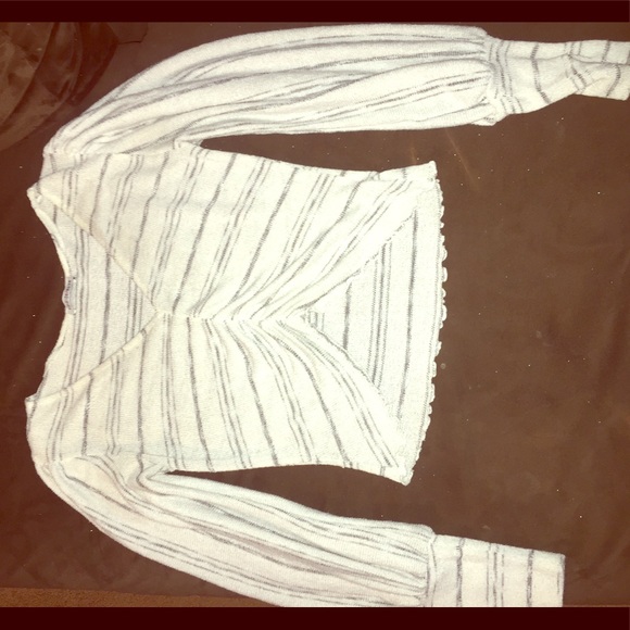 White striped blouse, cropped, lettuce edge, vneck deep cut,