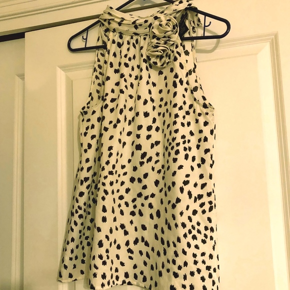 Super cute black and white satin top with a flower detail at the neck.