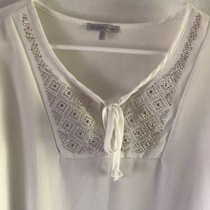 Lightweight top with bejeweled detail and tie front. Looks classy with a skirt/slacks for work or for a night out with jeans.