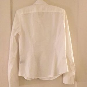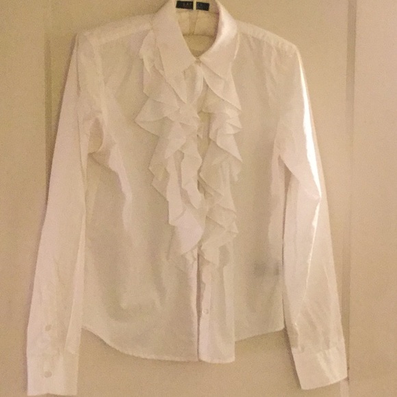 Form fitting ruffled white blouse. Front buttons 100% cotton. Button cuff