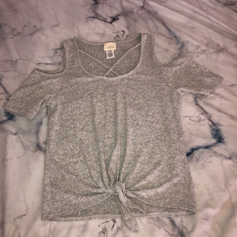 It’s a gray shoulder cut blouse with a tie in the front. It’s a rayon material. It needs to be hand washed with cold water and laid flat to dry.